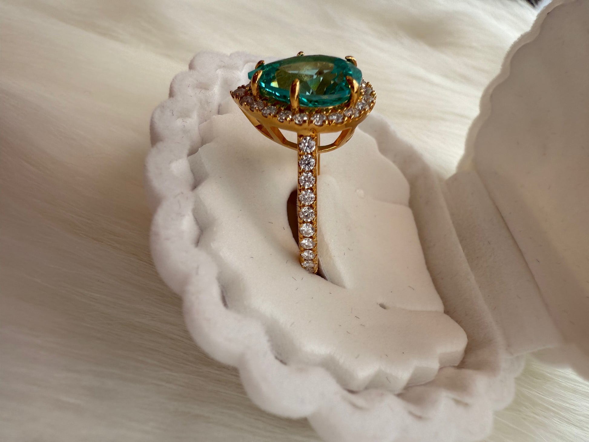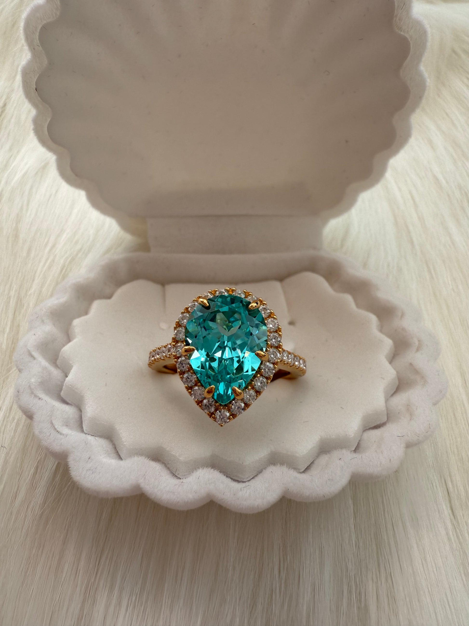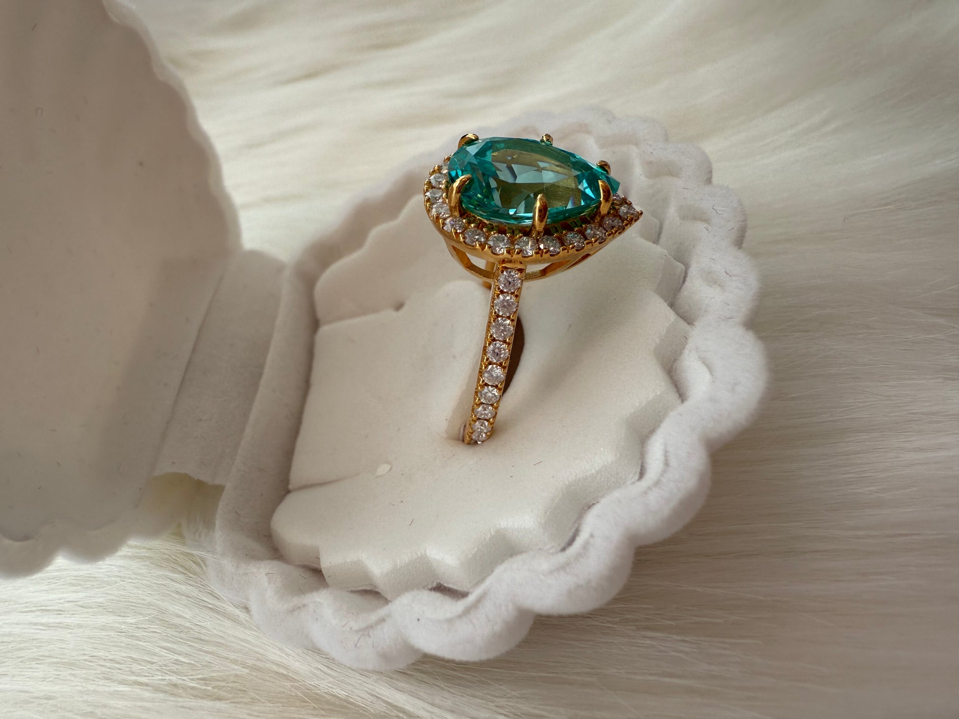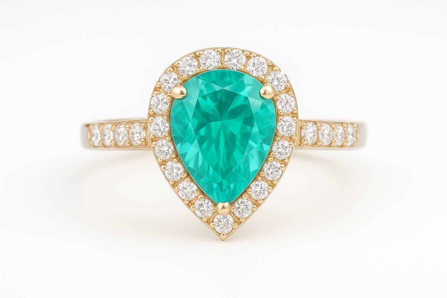 Striking and sophisticated, this ring features a 5.57ct lab-grown Paraiba gemstone in an elegant pear shape, celebrated for its vivid blue-green brilliance. The centerpiece is enhanced by the radiant sparkle of moissanite accents, flowing along a ¾ eternity band that catches the light from every angle.
