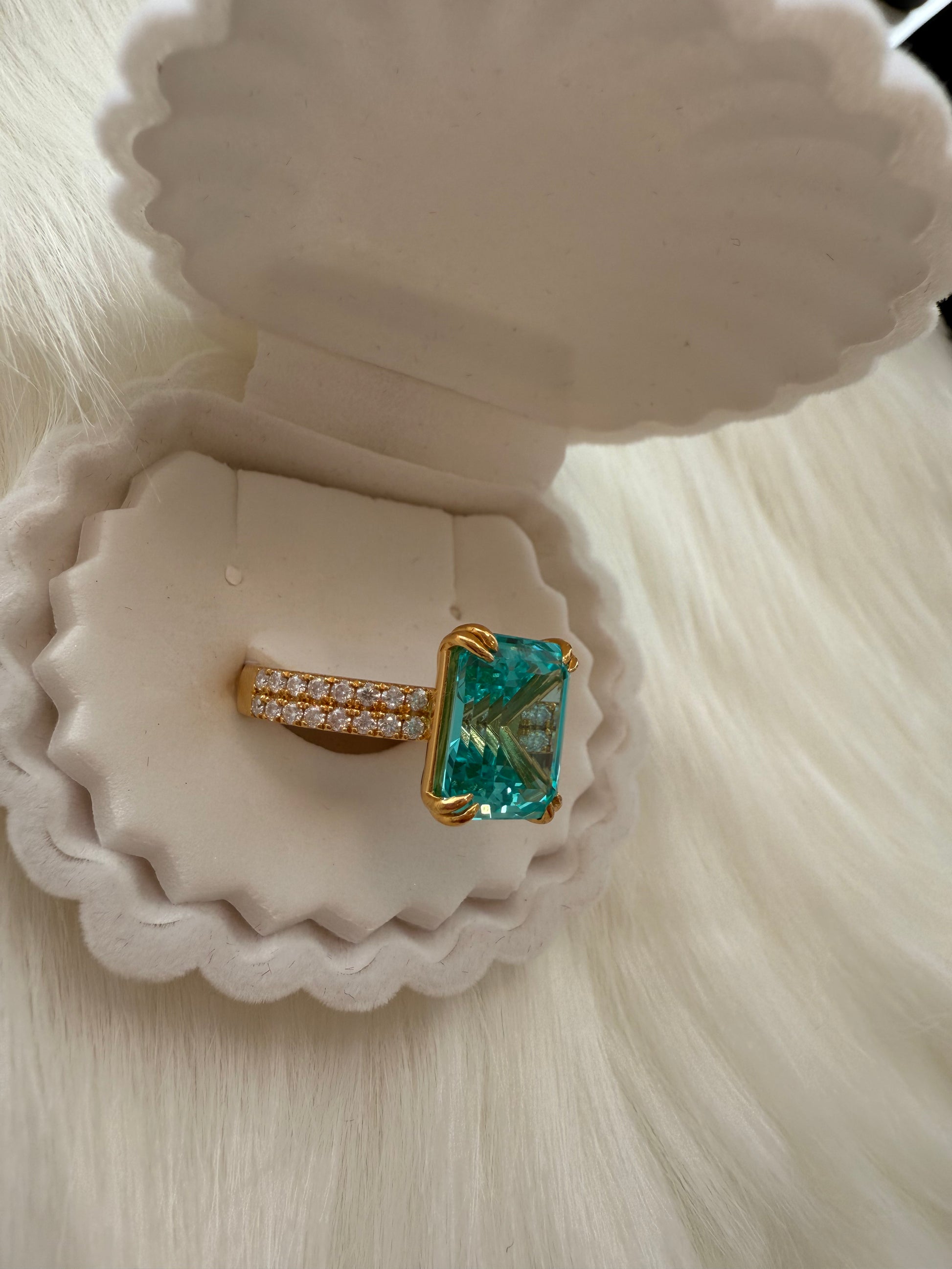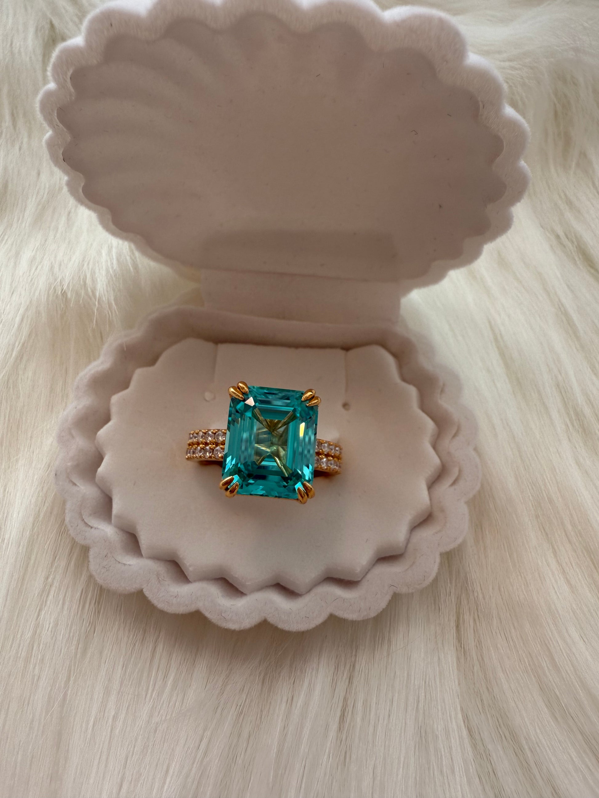 Set in 14K yellow gold plating over sterling silver, and crafted in size 7, this ring is the perfect balance of luxury and ethical elegance. A true statement piece designed to be admired from every angle, it embodies rarity, refinement, and timeless beauty.
