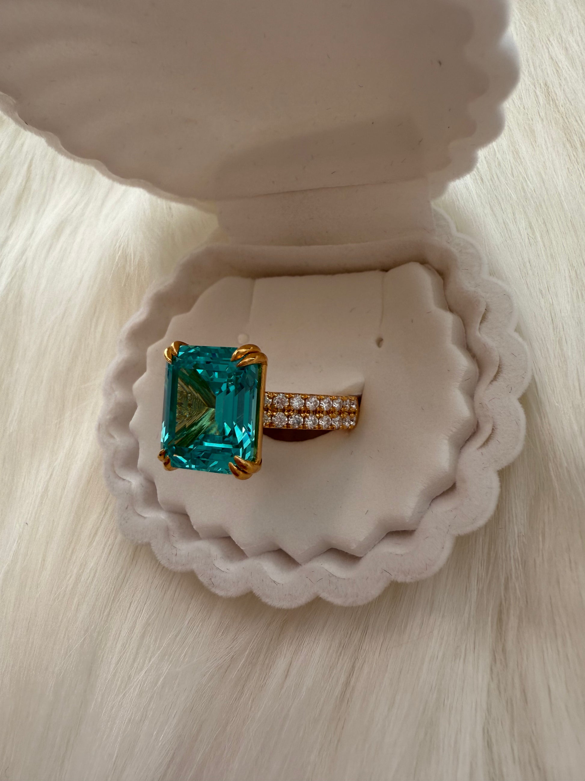 Bold yet refined, this exquisite ring showcases a 10.16ct certified lab-grown Paraiba gemstone in a captivating emerald cut, renowned for its rare blue-green brilliance. The centerpiece is framed with the radiant sparkle of premium moissanite, while the dual ½ eternity band shimmers with additional brilliance — creating a design that is both sophisticated and unforgettable.