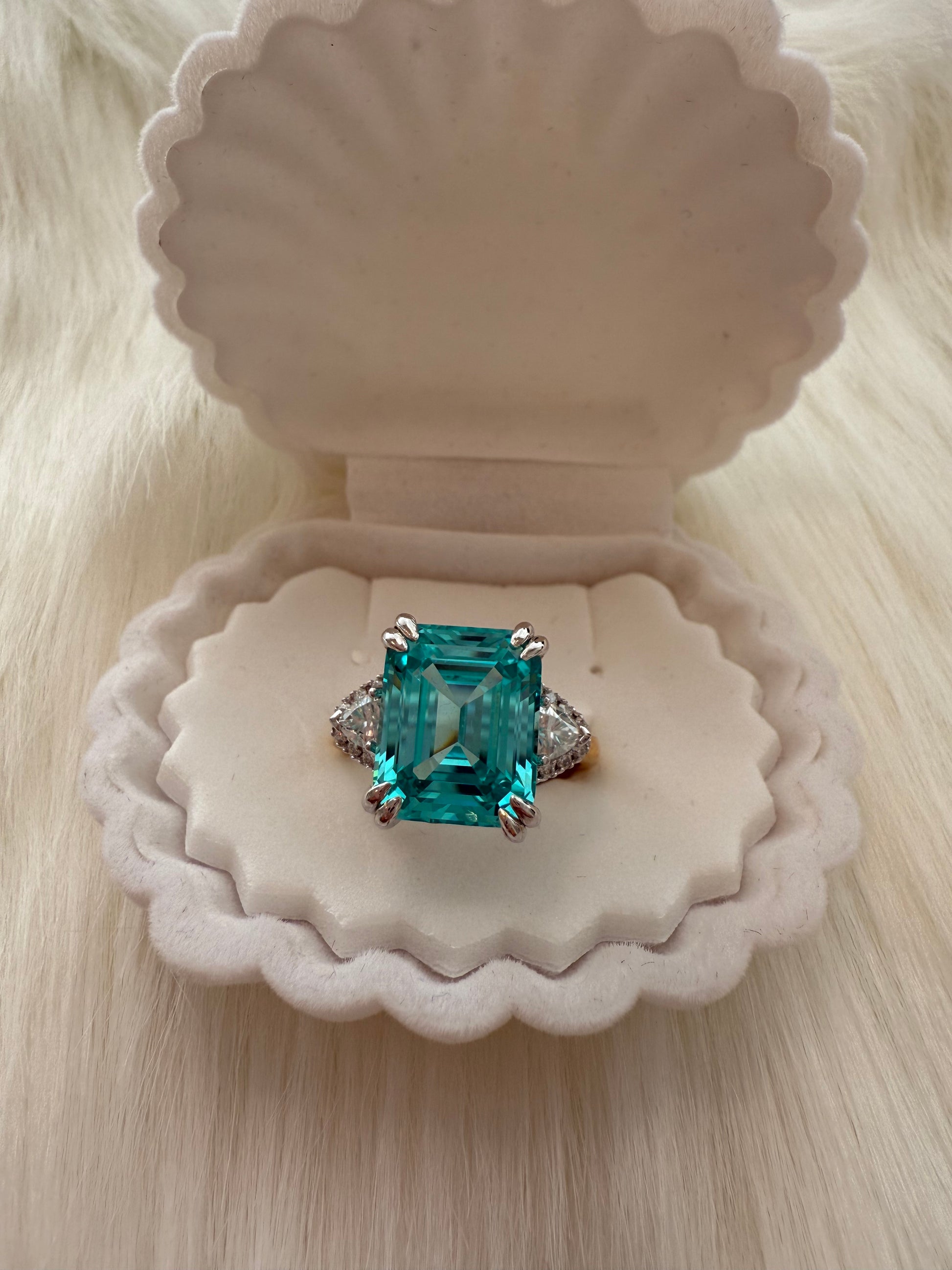 Commanding attention with its rare brilliance, this ring showcases a 10.26ct lab-grown Paraiba gemstone in a striking emerald cut, renowned for its vivid blue-green glow. Flanked by trillion-cut moissanite side stones, the design creates a perfect balance of bold color and scintillating sparkle.